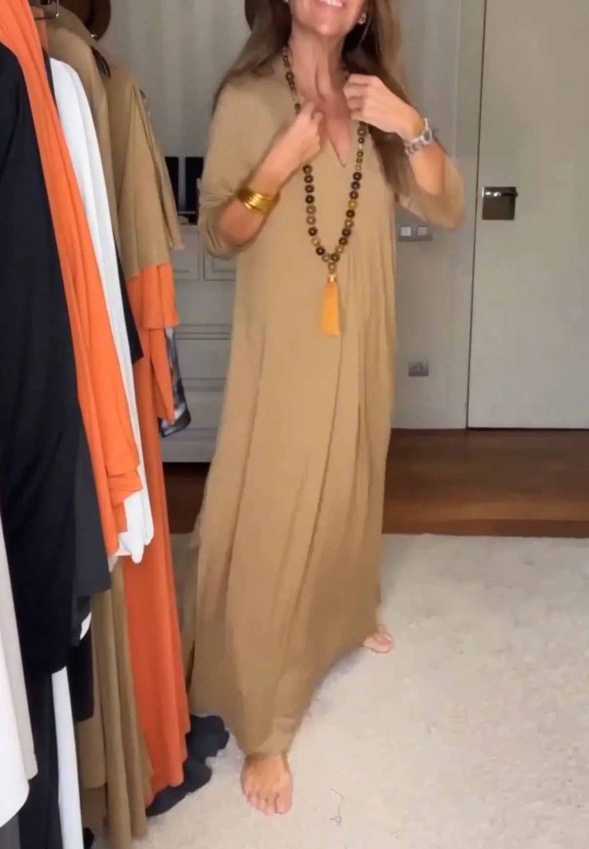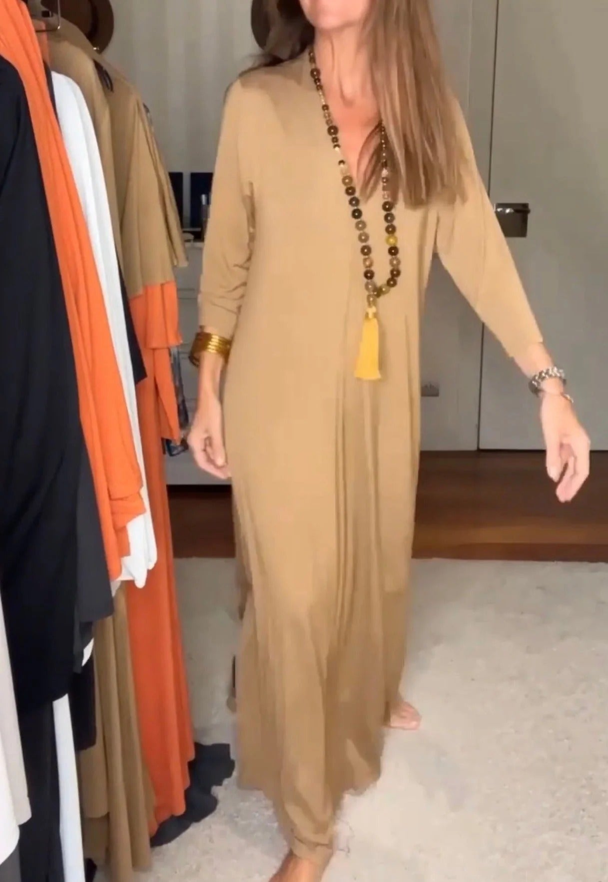 Descubre el equilibrio perfecto entre comodidad y estilo con "Pamela", un vestido largo en corte A y escote de pico, que te acompañará en cualquier ocasión.